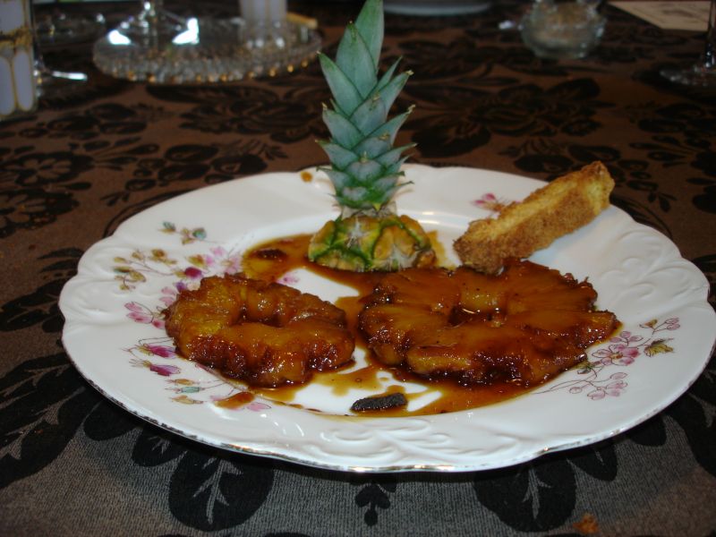 Présenter 2 tranches sur assiette par personne accompagnées de caramelie au Rhum et d’une boule de glace au Rhum raisin ou parfum de votre choix.